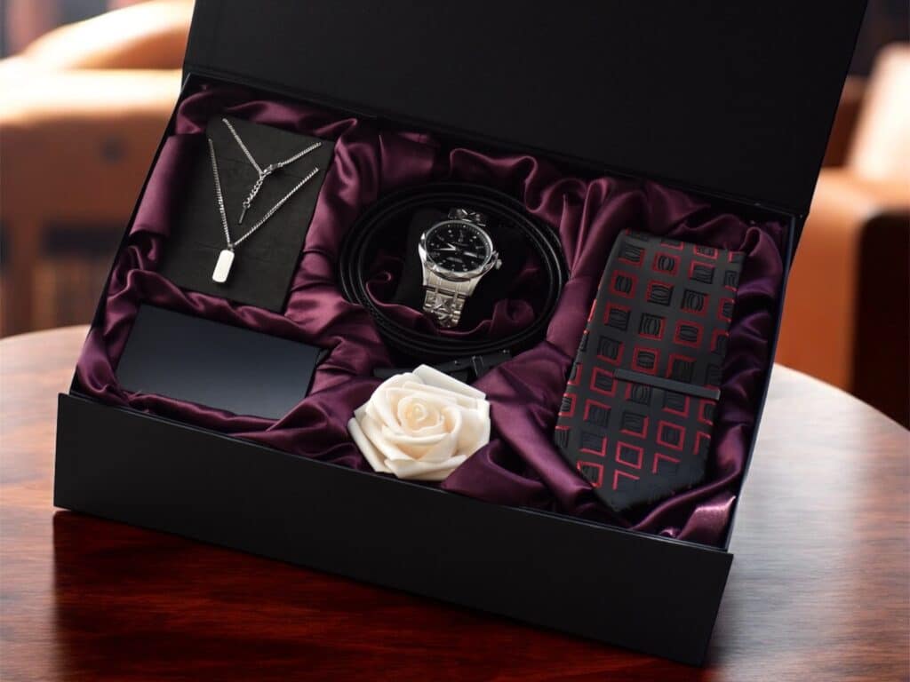 A gift box does more than hold items. Each element complements the others, creating a cohesive collection. A watch, wallet, belt, tie, and surgical steel accessories together form a balanced and stylish set. This approach removes the need to pick individual items and ensures a polished, premium look.