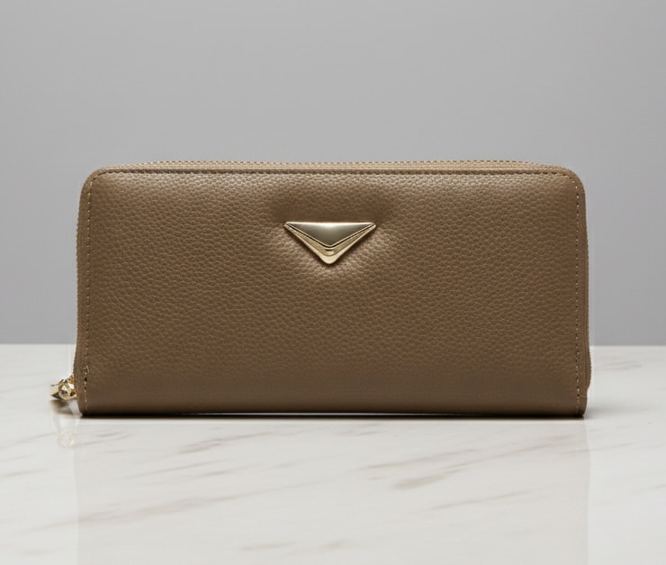 The wallet features a high-quality synthetic material with a soft pebble-grain texture. This durable finish feels pleasant to the touch and stands up to everyday use. A gold triangle-shaped metal detail at the center adds a minimalist touch of luxury and catches the eye without being excessive.