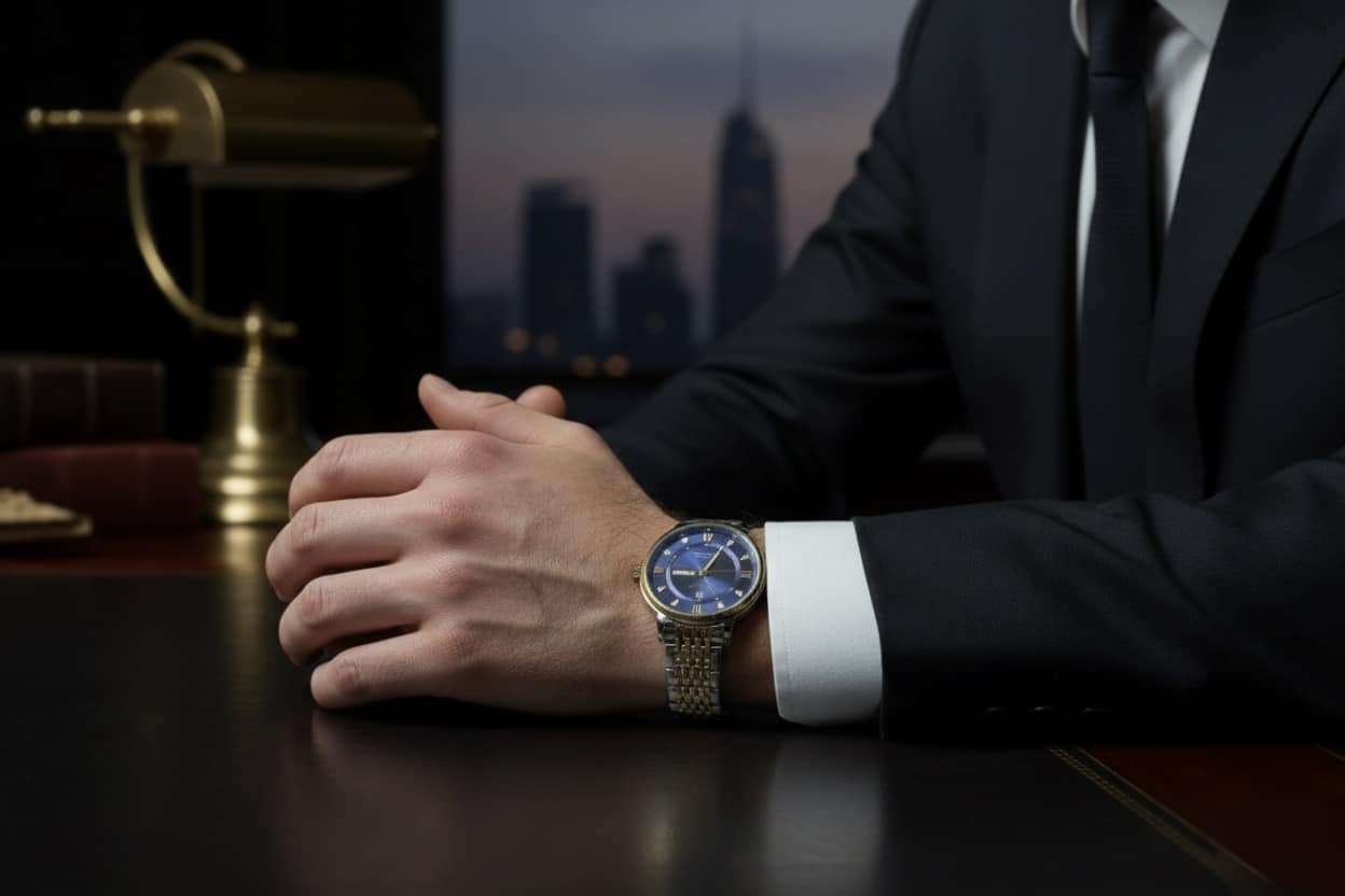 The 41 millimeter dial with 11 millimeter case thickness commands attention, while the deep blue face with gold accents creates a sophisticated visual impact. Luminous hands provide easy readability in all lighting conditions, and the day and date functions add practical value for everyday use. Scratch resistant mineral glass protects the dial and ensures it remains pristine over time.