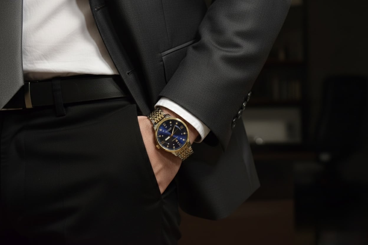 The Gentleman Gold Tone Watch Blue combines timeless style with modern engineering, making it an essential accessory for men who value both aesthetics and functionality. Crafted from high quality stainless steel and durable alloy, this watch ensures long lasting strength while maintaining a polished and confident appearance. Its silver and gold tone bracelet delivers a striking contrast, enhancing business attire, casual outfits, and fashion forward ensembles alike.