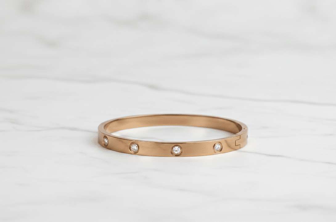 The Women bronze tone bracelet is crafted from premium Stainless steel, ensuring exceptional durability and a lasting mirror-like finish. Its sleek metallic lines are tastefully complemented by precisely set clear cubic zirconia that discreetly capture the light with every movement of your wrist. Featuring a clean design and a secure hinge closure, this piece is the perfect accessory for the woman seeking a blend of daily comfort and sophisticated style.