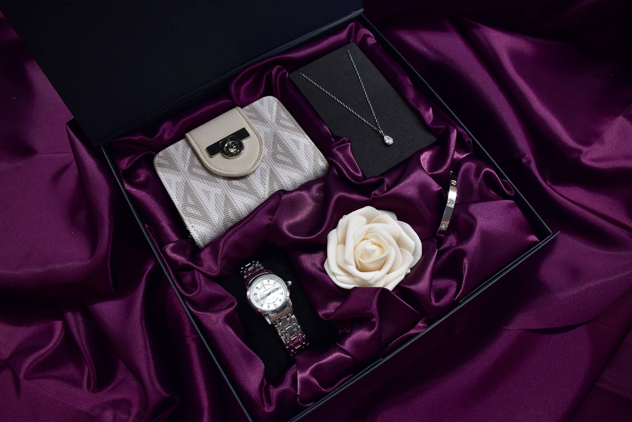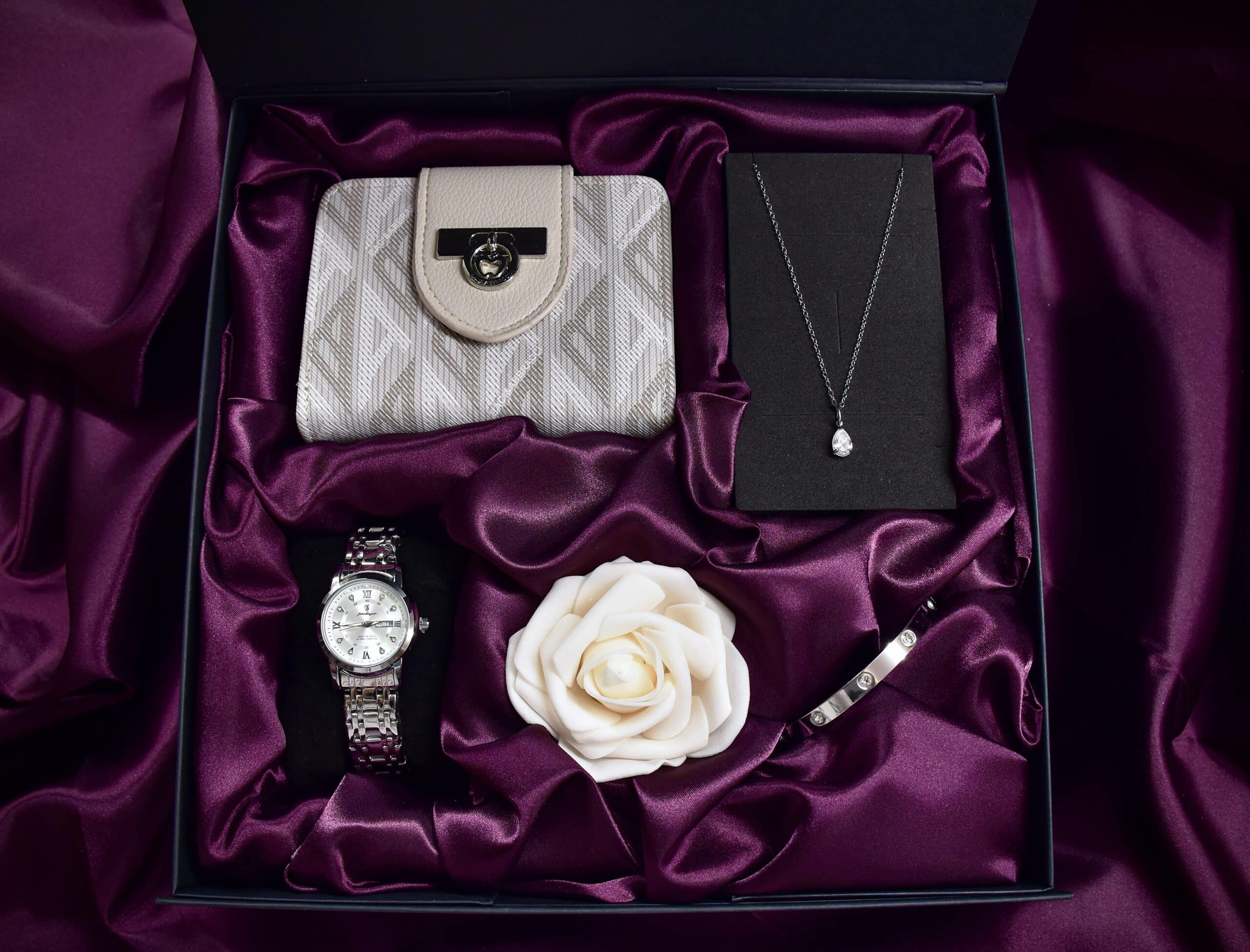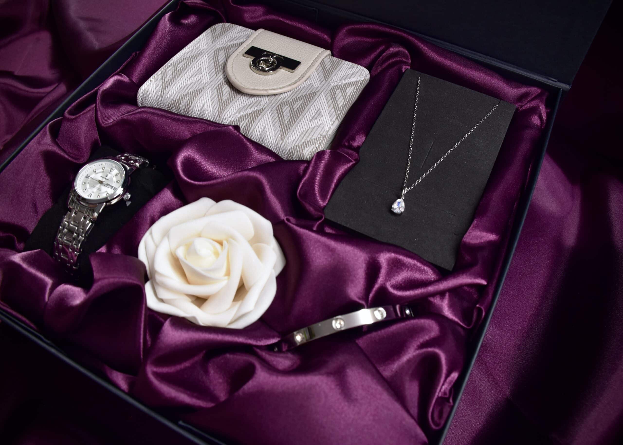 The Gift Set for Women Luxe Silver is a masterfully coordinated collection that combines a precision silver-tone watch, a stylish wallet, and delicate jewelry into one harmonious ensemble. Presented in hand-shaped burgundy satin, this set is designed to instantly boost confidence and add a touch of refined elegance to any outfit. With the included strap adjustment tool, the gift is ready to wear immediately, making it the perfect choice for any special occasion.