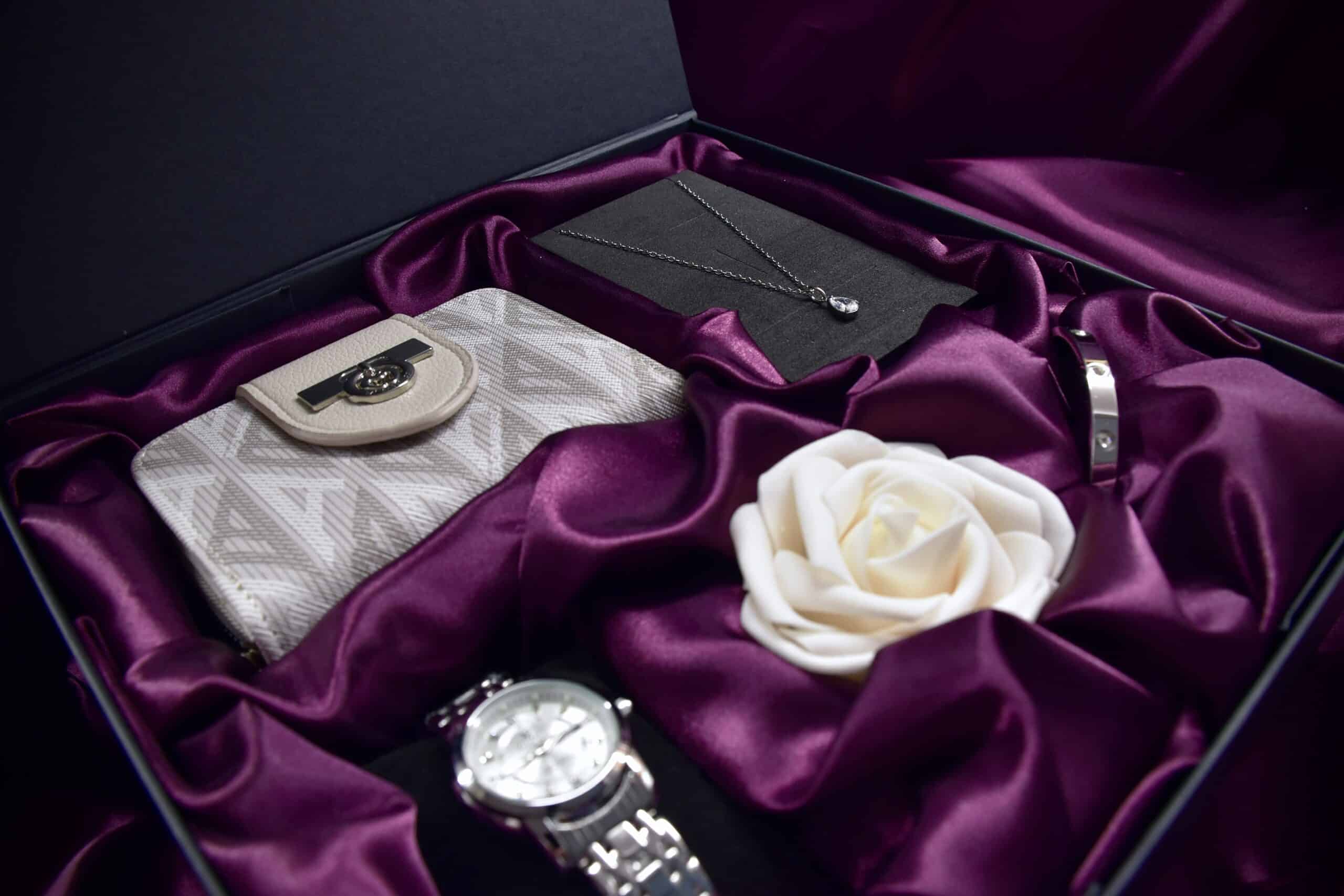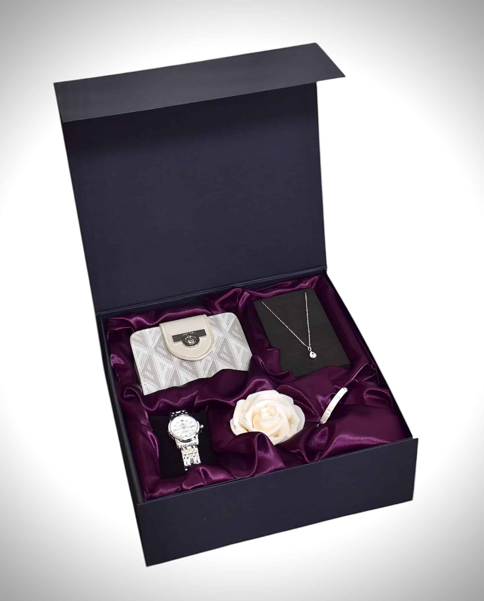 | Packaging | Magnetic black gift box with a burgundy satin handmade interior and white rose |