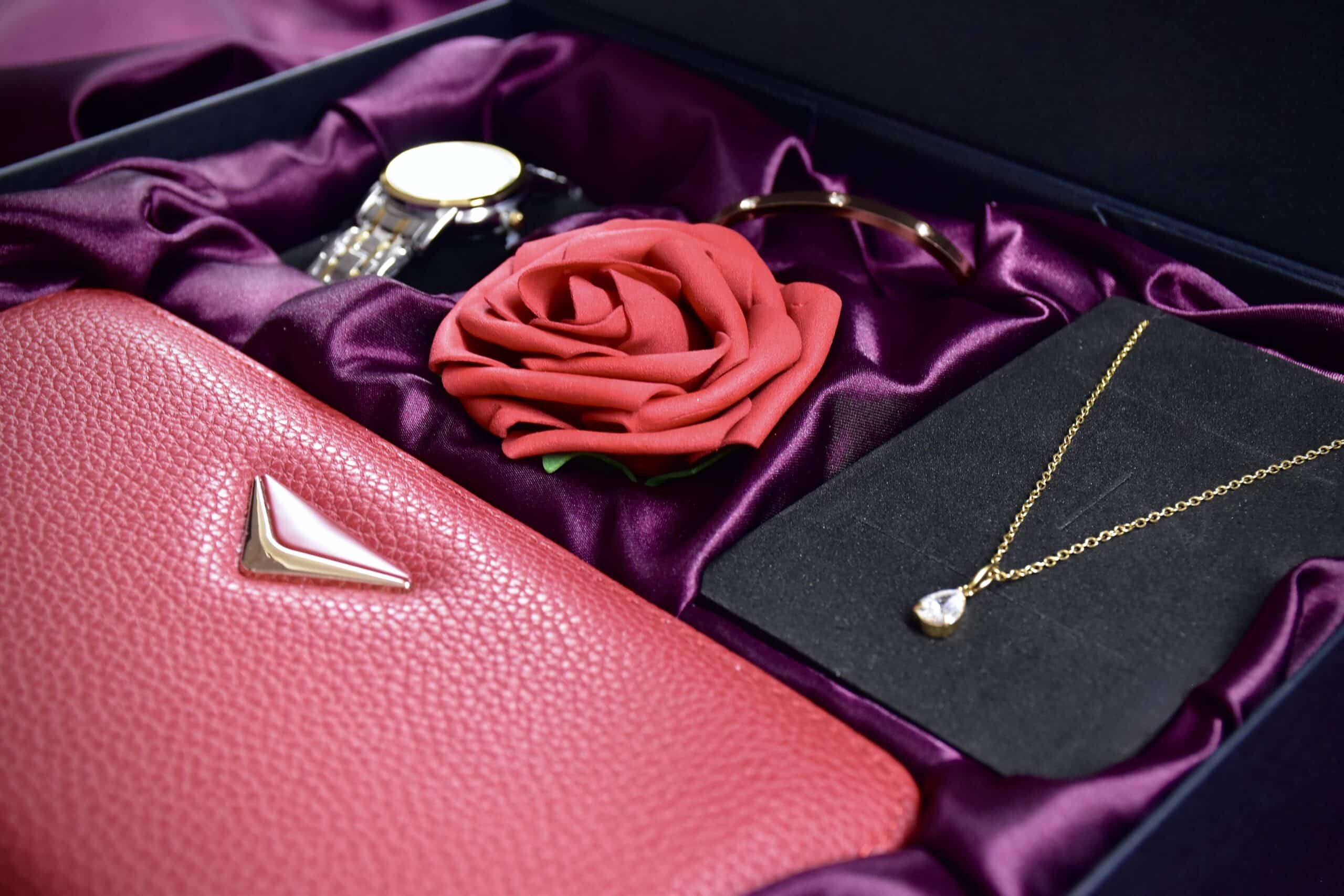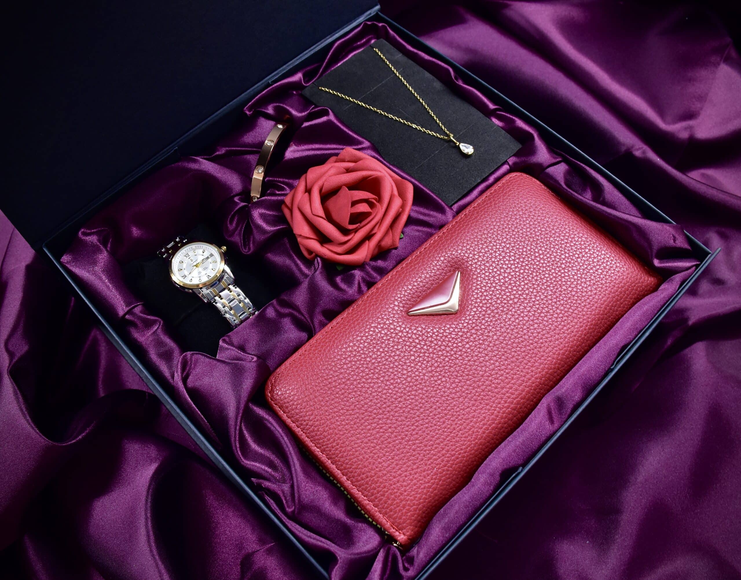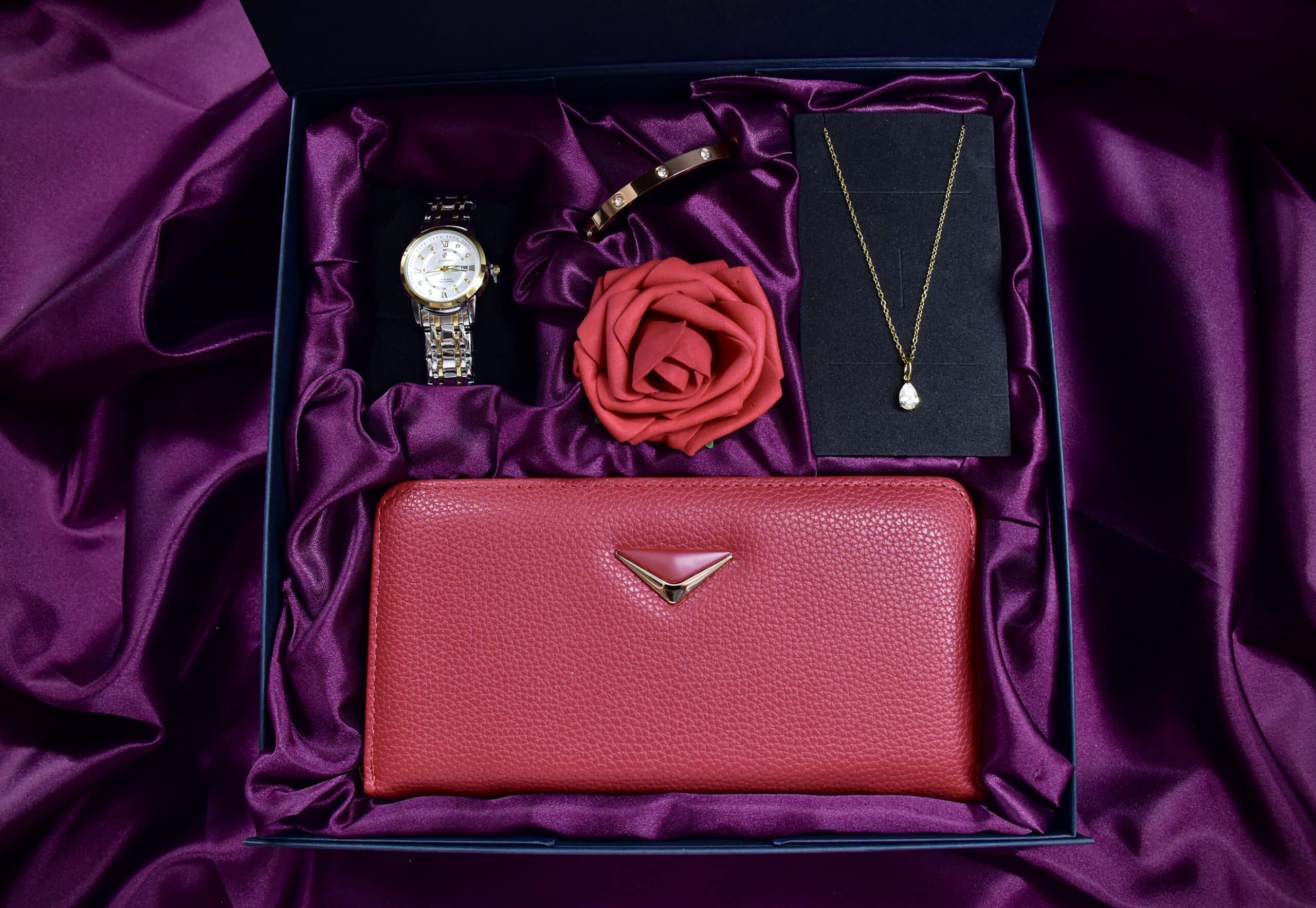 | Box contents | Women’s Analog Watch Red Women’s Wallet Women’s Necklace with Oval Pendant Women’s Crystal Bangle Bracelet |